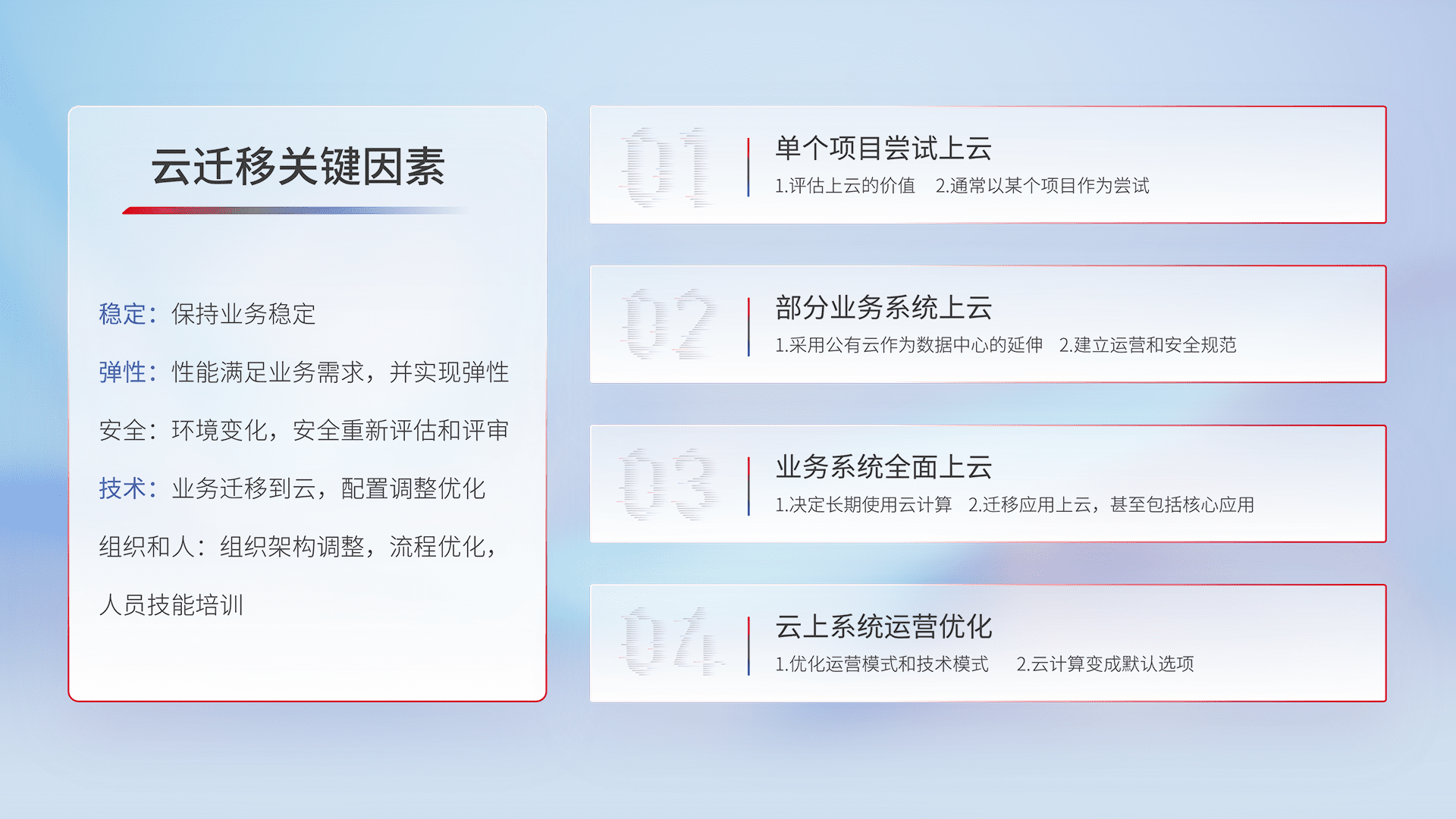 结合实际业务,,从规划设计、、、、云平台选型、、云原生改造、、、、数据迁移、、、、集成交付,,,,迁移全过程为客户识别最佳上云路径,,做好风险识别管理,,,设计网络架构、、、身份权限、、、、安全审计合规、、、操作审计、、、日志审计、、监控告警策略、、多站点容灾设计等,,,,对云上基础设施进行整体规划,,提升IT治理水平,,,,以满足弹性、、高可用、、、、高性能的需求。。。。