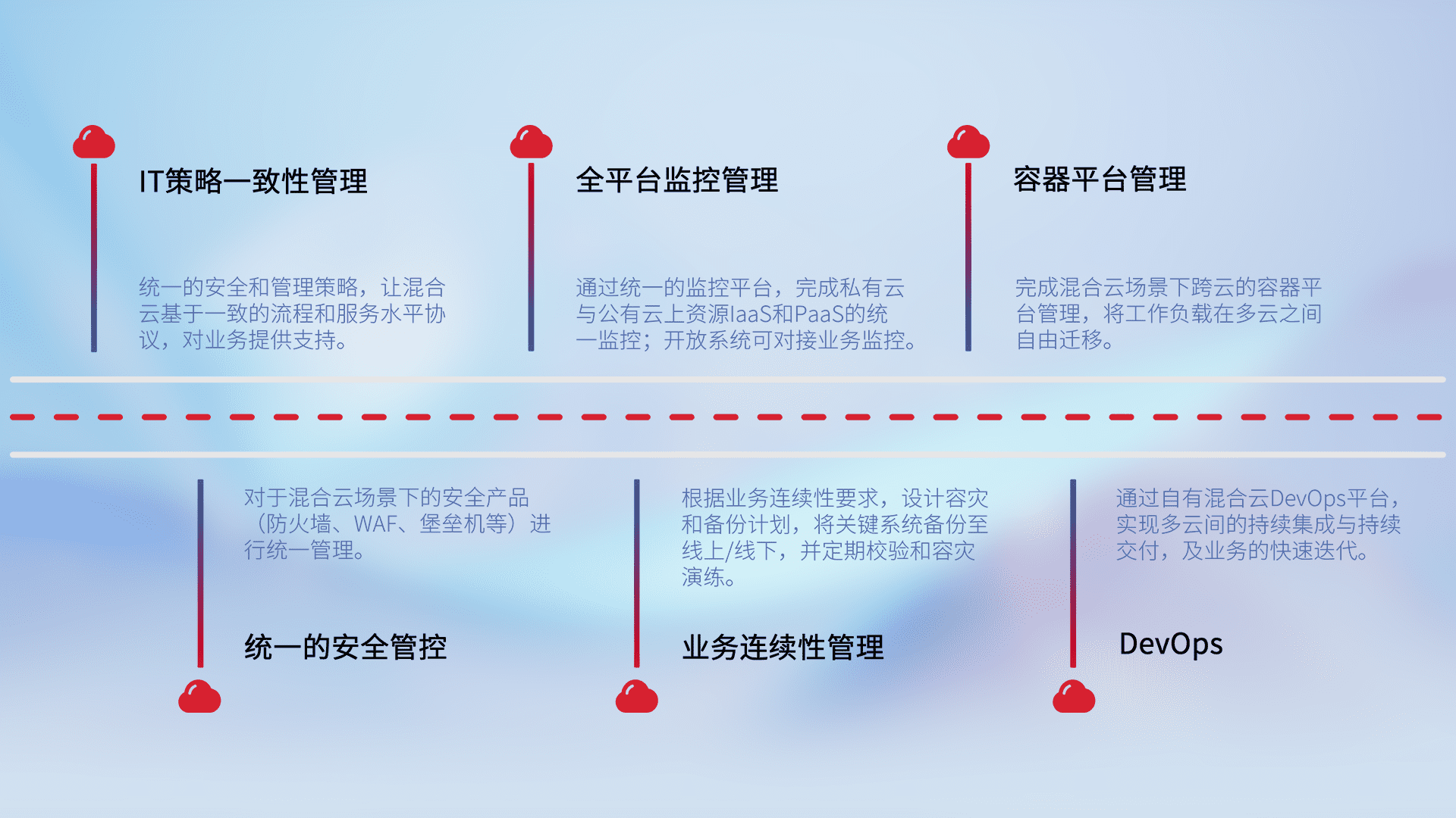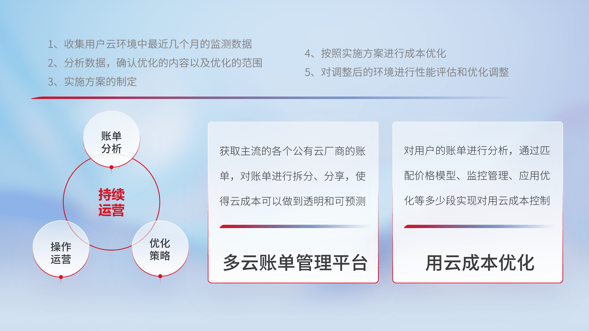 通过多云纳管,,,以统一的资源数据模型把客户的云资源进行抽象和封装,,,进而实现对多云资源的统一操作,,,,保障云资源管理的可靠性、、、、稳定性与可用性。。量身定制化运维内容,,,,配置、、、、开发运维、、、、补丁管理、、备份、、监控、、、、认证和访问管理、、审计和日常巡检等,,保障在用云过程中的可靠度,,,,稳定度以及高可用率。。