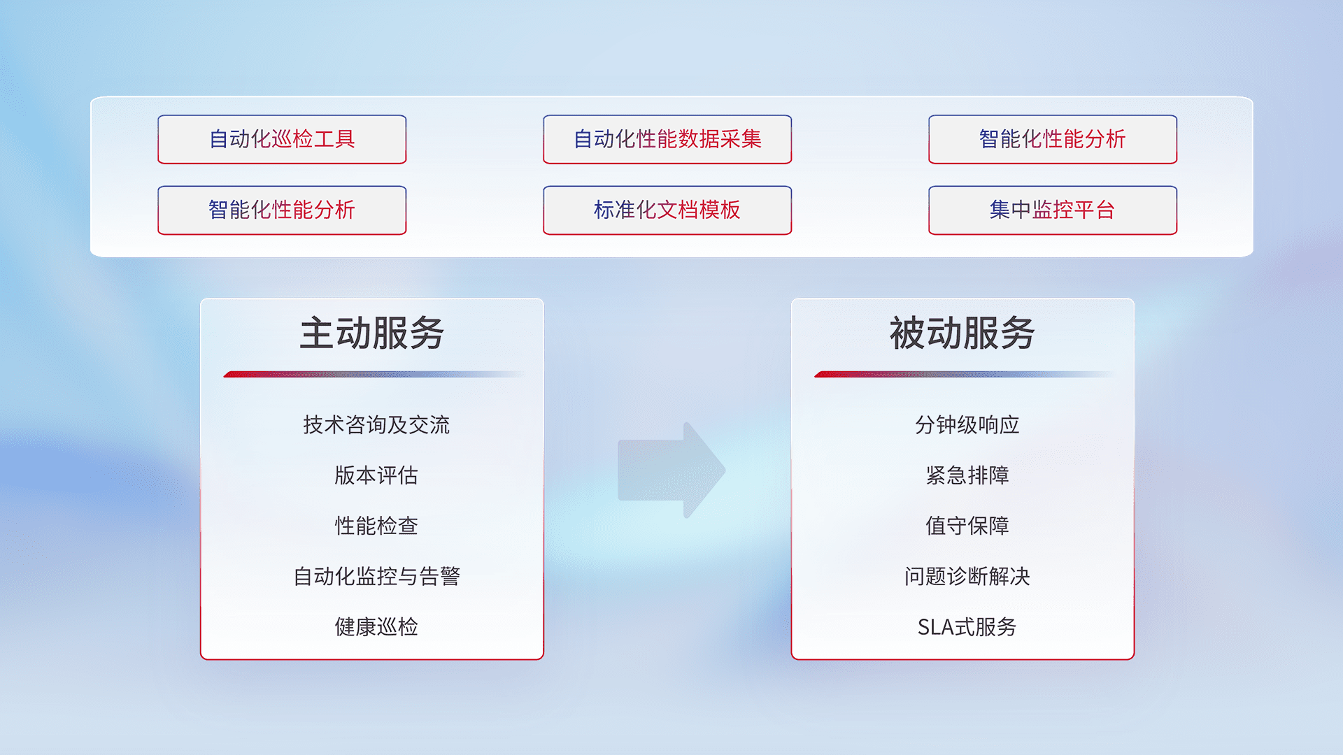智能化工具和标准化文档,,,,保障服务质量,,,提供主动服务(包含技术咨询、、、、版本评估、、、性能检查、、、自动化监控与告警、、、、健康巡检)和被动服务包含(分钟级响应、、、、紧急排障、、值守保障、、、问题诊断解决、、、SLA服务)。。